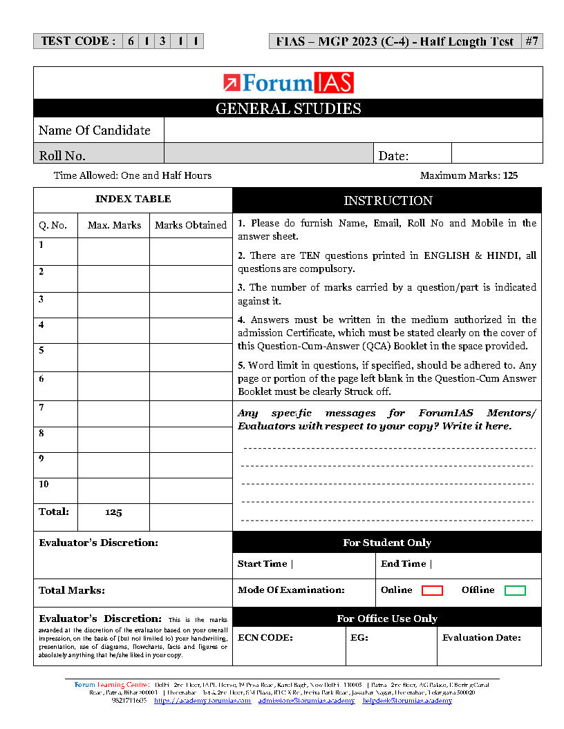 Forum IAS Mains MGP Cohort-4 Answerwritting Test Series 01 To 12 Bilingual 2023