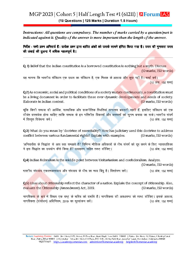 Forum IAS MGP Cohort-5 Questions With Solutions Mains Test Series 01 To 05 Hindi Medium 2023