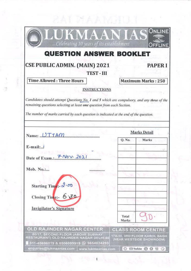 Lukmaan IAS Topper Copy Public Administration By Uttam (Air-121)English Medium 2021