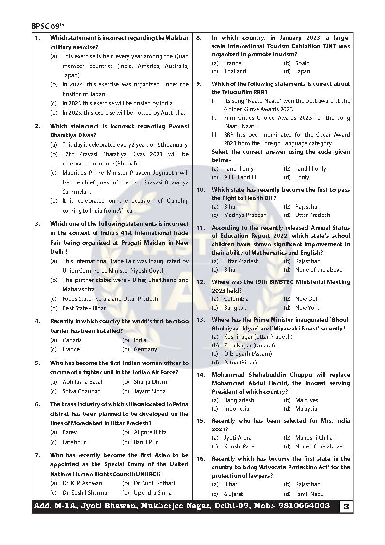 Aastha Ias 69th BPSC Prelims Test Series 01 To 10 Bilingual 2023