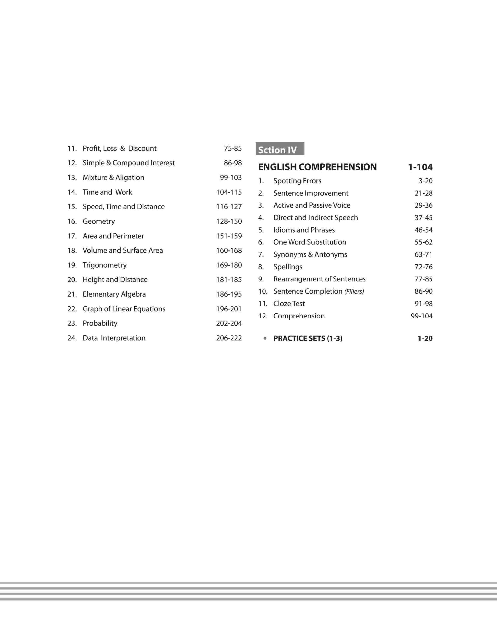 Current Affairs, Solved Papers 2023, Section I (General Intelligence & Reasoning) Section II (General Awareness), Section III (Quantitative Aptitude), Section IV (English Comprehension), Practice Sets (1-3) BOOK STRUCTURE Current Affairs Solved Papers 2023 Entire syllabus divided into 4 sections Practice sets (1-3) BOOK FEATURES Sectionwise division of the entire syllabus Each chapter includes: To the point study notes 5000+ Topicwise MCQs for practice CGL PYQs Latest CGL Tier I Solved Papers 2023 In detailed solution to each question All latest events and happenings are covered in a separate section 3 practice sets to self-assess the preparation level WHY THIS BOOK? Revised as per the examination pattern to help you crack SSC CGL 2024 exam Comprehensive coverage of the entire syllabus with concise study notes for thorough understanding Provides extensive practice, exam pattern familiarity, and apt for self-assessment Offers Free online support with; SSC CGL 2024 Exam Strategy, Test Package (5 Mock Tests, 20 Sectional Tests), 3 Months Current Affairs, and 24/7 Doubt Solver
