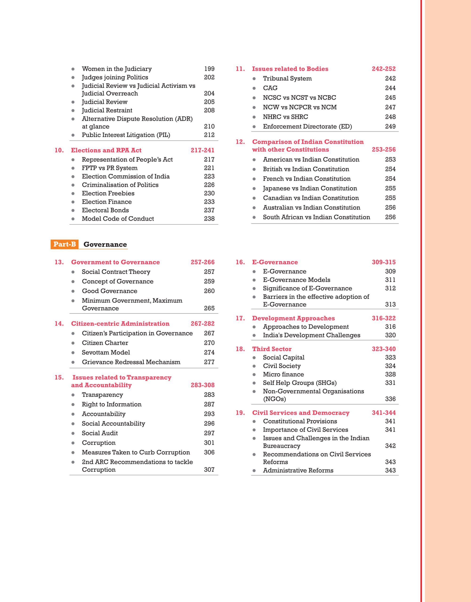 Table Of Content PART A: Indian Polity, PART B: Governance BOOK STRUCTURE Division of the book into 2 Parts: Indian Polity and Governance BOOK FEATURES Comprehensive and Exam-Oriented Content: Covering all the topics in detailed manner Content Enrichment: Inclusion of Current Examples, Data & Facts, Case Studies, and Supreme Court Judgements Innovative Exam-ready Frameworks: To enhance answer writing skills and feature PESTAL, Stakeholder, Life-cycle, etc. framework Visually appealing presentation: With Flowcharts, Timelines, Mind maps, Hand-drawn Diagrams, Tables, and Maps PYQs Integration: Each chapter end has PYQs that aligns the content with the recent exam trends Multiple Revision: Easy revise the entire syllabus and improve the Mains score