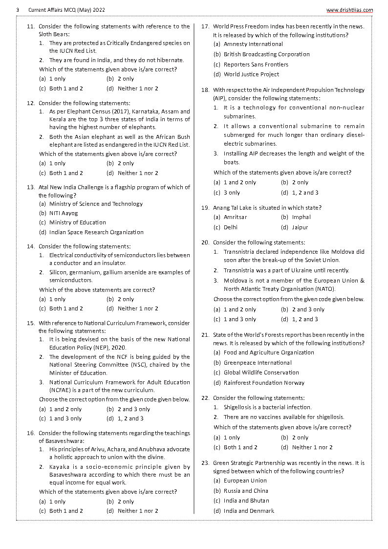 Drishti IAS Current Affairs MCQ Quiz Consolidation May Part I & II 2022 English Medium