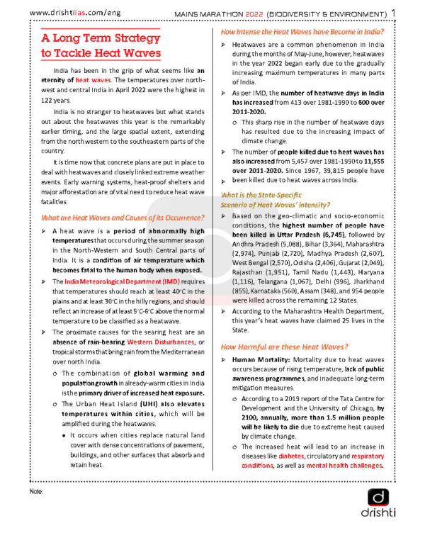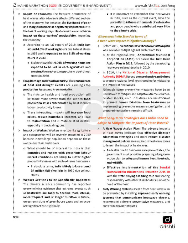 Drishti IAS Mains Marathon Biodiversity & Environment English Medium 2022 Total Pages- 81 One Booklet 1. A Long Term Strategy to Tackle Heat Waves 2. The Inherent Benefits of Carbon Farming 3. Connecting Nature With Humanity 4. Tackling Methane Emission 5. Urban Planning and Climate 6. Heat Extremes in India 7. Making Groundwater ‘Visible’ 8. India and the Sixth Assessment Report 9. Tackling Agri-Emissions 10. Towards Net Zero 11. Protecting Western Ghats 12. Handling The Plastic Menace 13. COP26 – Achievements and Scope 14. Climate Goals and Vehicular Emissions 15. Carbon Neutrality : India’s Target 16. A Mindful Development 17. Agriculture and Environment 18. Cyclone Resilient Planning 19. Climate Change and Big Businesses 20. Thawing Permafrost 21. Wounded Mountains 22. Changing Monsoon & Agriculture 23. Overlapping Hazards 24. Blue-Green Economic Model of Development 25. National Mission on Biodiversity and Human Well-Being 26. Environment Tax 27. Natural Gas: A Stepping Stone 28. Decentralizing Climate Assistance 29. Cleaning Ganga 30. Chamoli Flash Floods 31. Nature-Based Solutions 32. Melting of the Arctic 33. Sustainable Mining 34. No Wild, No Life 35. COP26 – Need For Climate Equity 36. Watershed Management 37. Carbon Farming 38. Microplastics 39. Environment (Protection) Act, 1986 40. Wildlife (Protection) Act (WPA), 1972 41. Environmental Impact Assessment (EIA): Draft 2020 42. Wetlands 43. Mains Questions