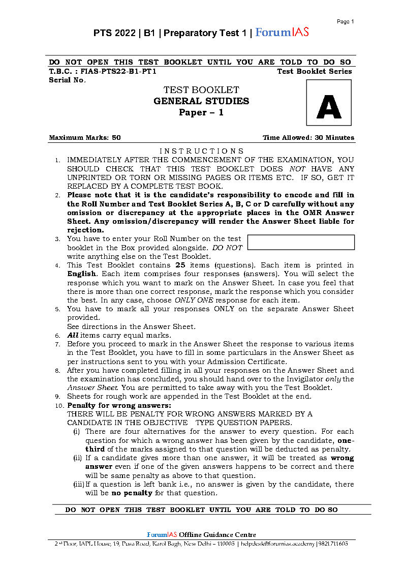 Forum Ias General Studies Prelims Preparatory Mini Test 2022 English Medium