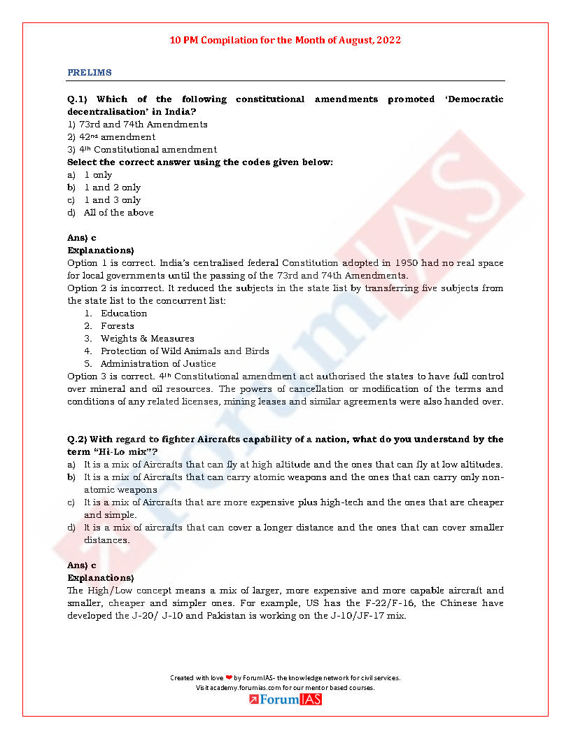 Forum IAS Monthly 10 PM Current Affair Quiz Compilation August 2022 Printed Notes English Medium