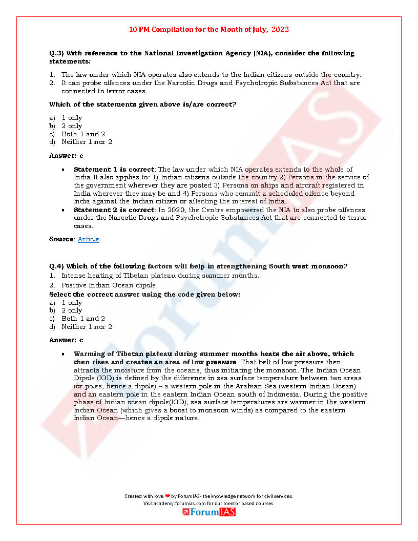 Forum IAS Monthly 10 PM Current Affair Quiz Compilation July 2022 Printed Notes English Medium