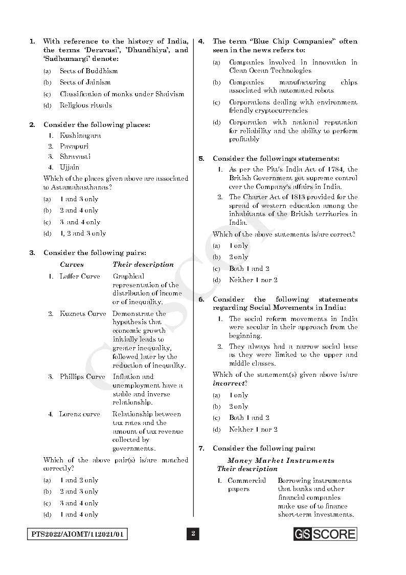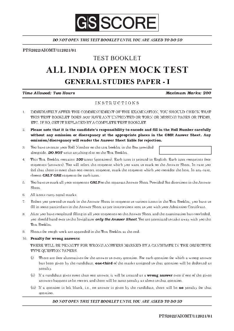 GS Score Ias GS Prelims All India Open Mock Test Series 01 to 10 English Medium 2022
