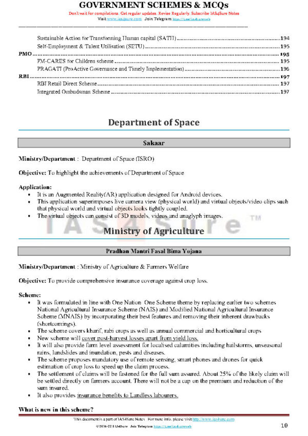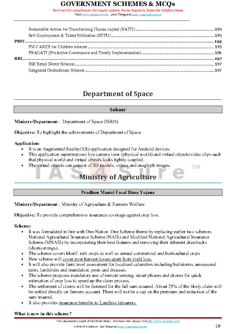 IAS 4 Sure Government Schemes Revision Notes For Prelims English Medium 2022 Total Pages- 200 1. Department of Space 2. Ministry of Agriculture 3. Ministry of Animal Husbandry 4. Ministry of Ayush 5. Ministry of Chemicals and Fertilisers 6. Ministry of Civil Aviation 7. Ministry of Commerce and Industry 8. Ministry of Communications 9. Ministry of Consumer Affairs and Public Distribution 10. Ministry of Co-operation 11. Ministry of Culture 12. Ministry of Development of Northeastern Region 13. Ministry of Drinking Water and Sanitation 14.Ministry of Earth Sciences 15. Ministry of Education 16. Ministry of Environment and Fores 17. Ministry of External Affairs 18. Ministry of Finance 19. Ministry of Food Processing Industries 20. Ministry of Health and Family Welfare 21. Ministry of Heavy Industry 22. Ministry of Home Affairs 23. Ministry of Housing and Urban Affairs 24. Ministry of Information and Broadcasting 25. Ministry of IT 26. Ministry of Jal Shakti 27. Ministry of Labor and Employment 28. Ministry of Law and Justice 29. Ministry of Micro, Small and Medium Enterprises 30. Ministry of Mines 31. Ministry of Minority Affairs 32. Ministry of New and Renewable Energy 33. Ministry of Panchayati Raj 34. Ministry of Petroleum and Natural Gas 35. Ministry of Power 36. Ministry of Railways 37. Ministry of Road Transport and Highways 38. Ministry of Rural Development 39. Ministry of Science and Technology 40. Ministry of Shipping 41. Ministry of Skill Development and Entrepreneurship 42. Ministry of Social Justice and Empowerment 43. Ministry of Statistics and Programme Implementation 44. Ministry of Steel 45. Ministry of Textile 46. Ministry of Tourism 47. Ministry of Tribal Affairs 48. Ministry of Urban Development 49. Ministry of Women and Child Development 50. Ministry of Youth Affairs 51. NITI Ayog 52. PMO 53. RBI