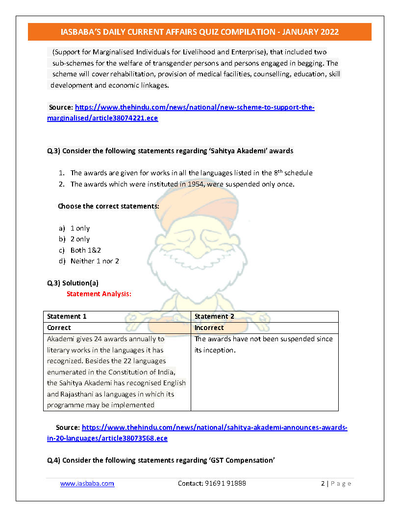 IAS Baba’s Daily Current Affairs Quiz Compilation UPSC January 2022 English Medium