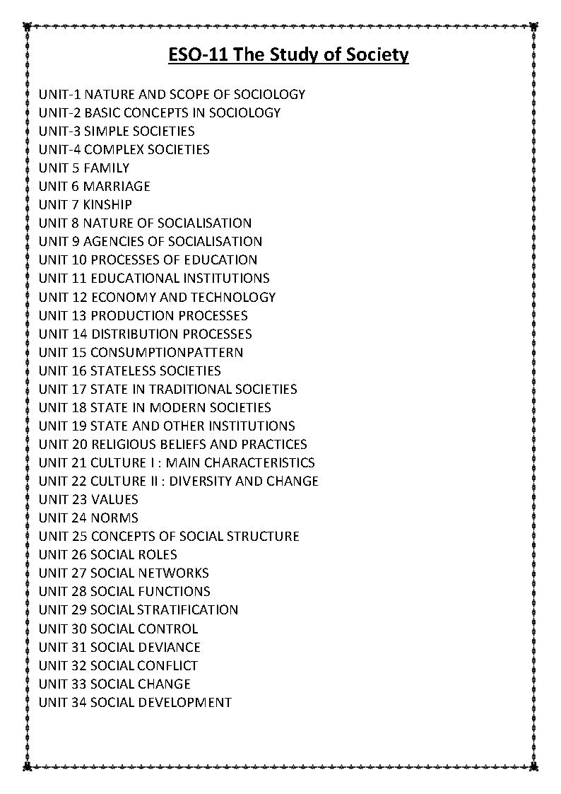 Total-10 Booklets ESO-11 The Study of Society ESO-12 Society in India Part-I ESO-12 Society in India Part-II ESO-13 Sociological Thought Part-I ESO-13 Sociological Thought Part-II ESO-14 Society and Stratification ESO-15 Society and Religion Part-I ESO-15 Society and Religion Part-II ESO-16 Social Problems in India Part-I ESO-16 Social Problems in India Part-II