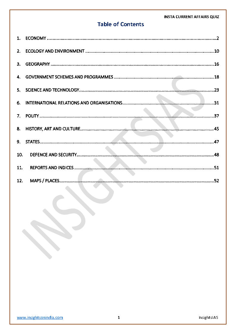 Insight IAS Insta Current Affairs Quiz April 2022 Printed Notes English Medium Total Pages- 56 Content 1. Economy 2. Ecology and Environment 3. Geography 4. Government Schemes and Programmes 5. Science and Technology 6. International Relations and Organisation 7. Polity 8. History, Art and Cult 9. States 10. Defence and Security 11. Reports and Indices 12. Maps / Places