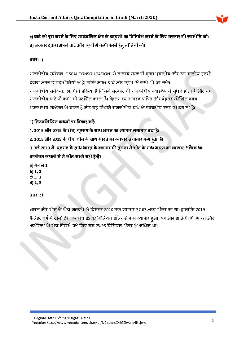 Insights IAS Insta Current Affairs Quiz Monthly Compilation March 2021 Printed Notes Hindi Medium