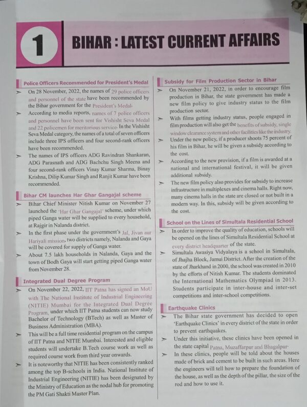 Key Features . Nobel Award 2022 . Khel Ratna Award 2022 . Budget 2022-23 . Pulitzer Award 2022 . Padma Award 2022 . Important Index 2021-22 . ISFR Report 2021 . Tokyo Olympic/Paralympics 2020 . Current Affairs : MCQs Contents BIHAR SPECIAL . Bihar: At a Glance 1. Bihar: Latest Current Affairs 2. Bihar: Current Affairs 3. Bihar: Current Reminder 4. Bihar: Hit MCQs