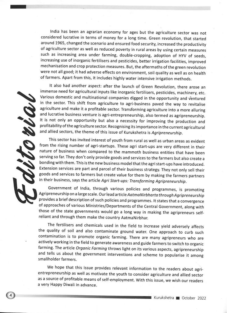 Kurukshetra Agripreneurship October Printed Notes 2022 English Medium