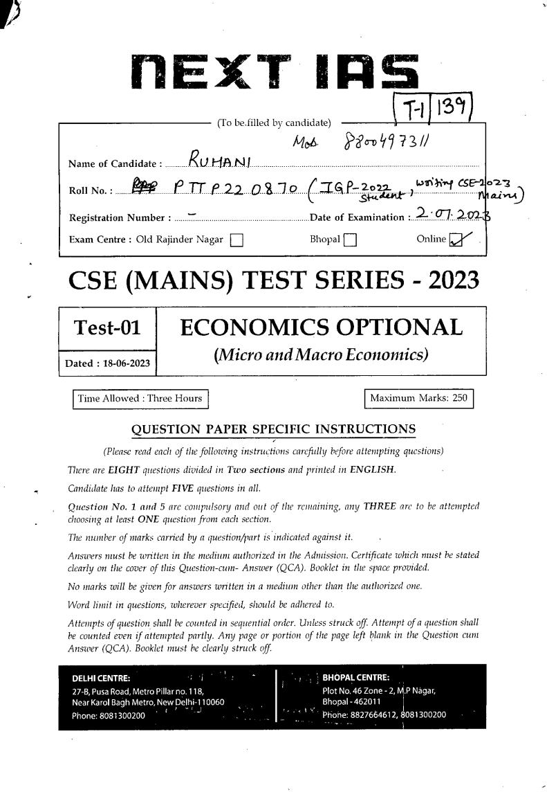 Next Ias Topper Copy Economics Optional By Ruhani Rank 5, 2023 English Medium
