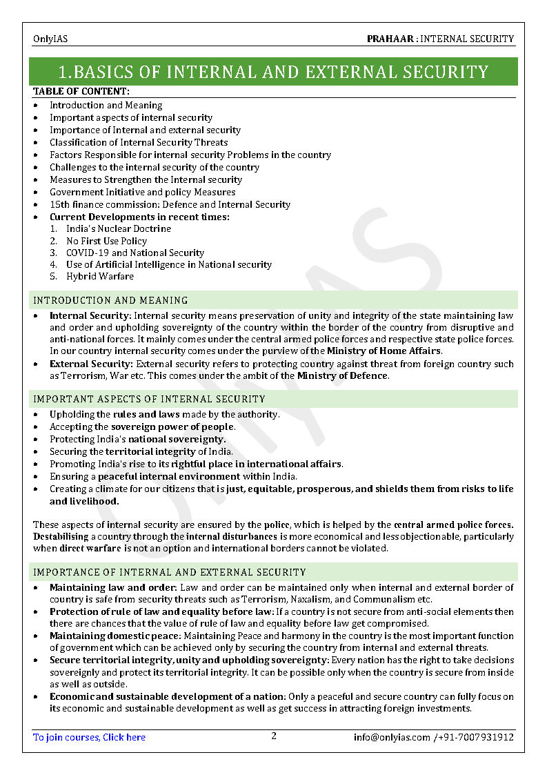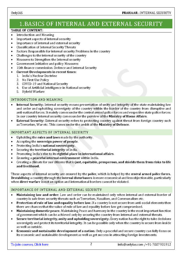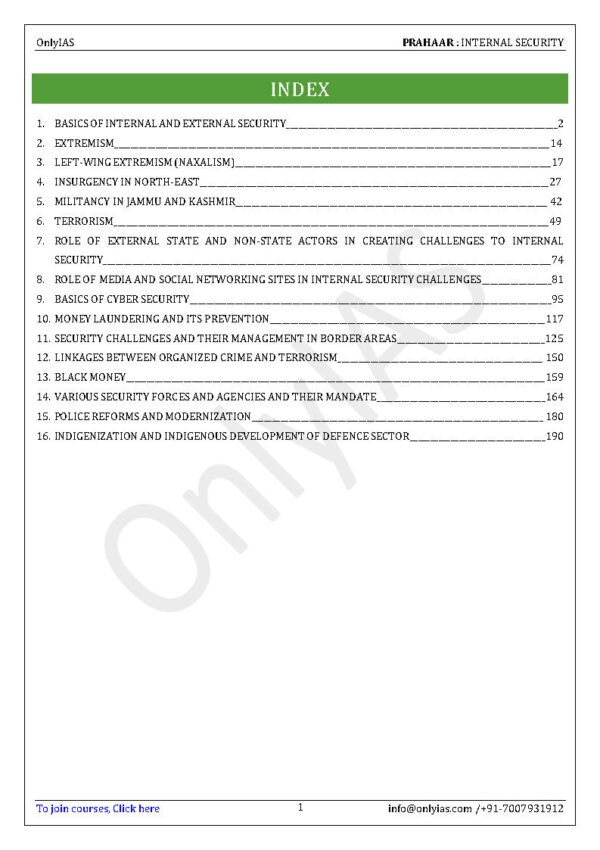 Total 196 pages 1. BASICS OF INTERNAL AND EXTERNAL SECURITY 2. EXTREMISM 3. LEFT-WING EXTREMISM (NAXALISM) 4. INSURGENCY IN NORTH-EAST 5. MILITANCY IN JAMMU AND KASHMIR 6. TERRORISM 7. ROLE OF EXTERNAL STATE AND NON-STATE ACTORS IN CREATING CHALLENGES TO INTERNAL SECURITY 8. ROLE OF MEDIA AND SOCIAL NETWORKING SITES IN INTERNAL SECURITY CHALLENGES 9. BASICS OF CYBER SECURITY 10. MONEY LAUNDERING AND ITS PREVENTION 11. SECURITY CHALLENGES AND THEIR MANAGEMENT IN BORDER AREAS 12. LINKAGES BETWEEN ORGANIZED CRIME AND TERRORISM 13. BLACK MONEY 14. VARIOUS SECURITY FORCES AND AGENCIES AND THEIR MANDATE 15. POLICE REFORMS AND MODERNIZATION 16. INDIGENIZATION AND INDIGENOUS DEVELOPMENT OF DEFENCE SECTOR