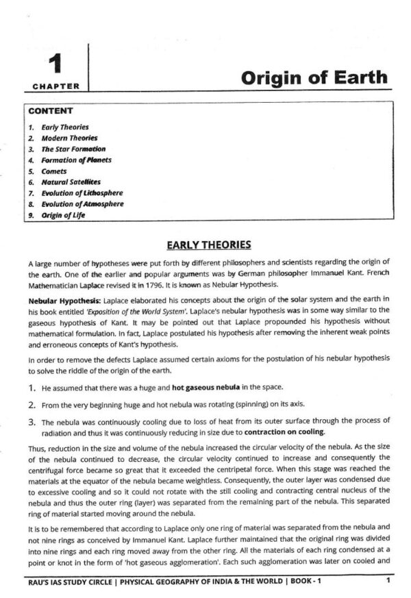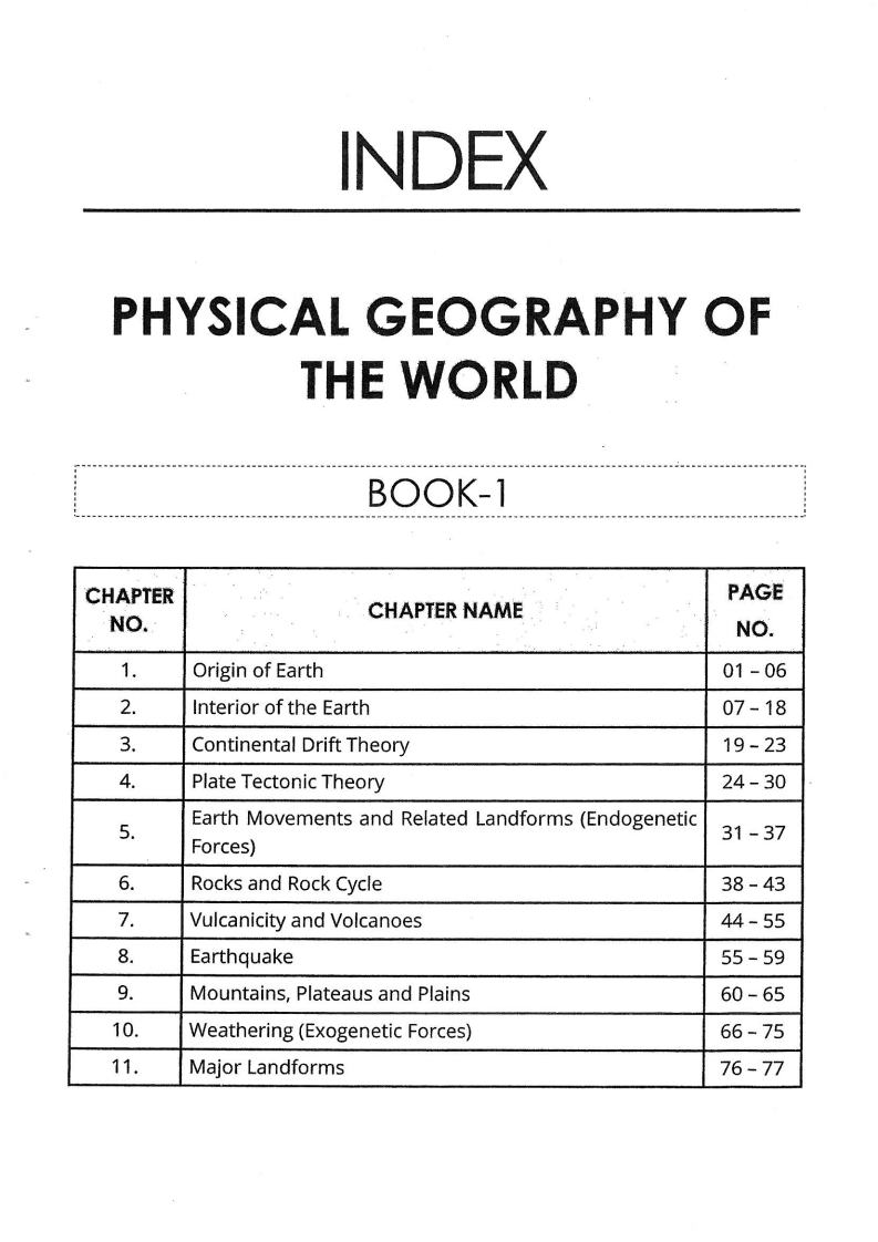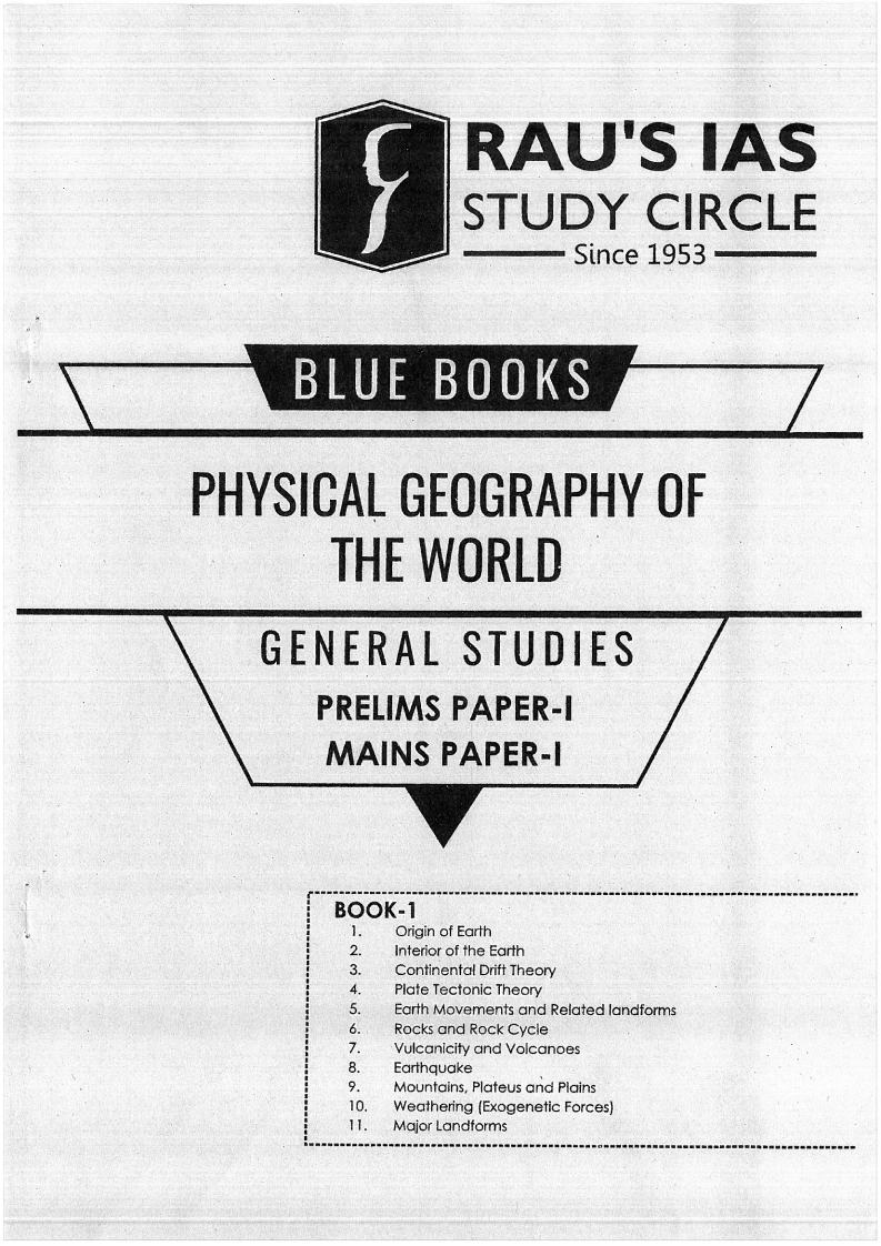Rau’s IAS General Studies Physical Geography Of The World Prelims Paper-I Mains Paper-I Blue Book Printed Notes English Medium Total Pages- 426 One Booklet BOOK-I (i) Origin of Earth (ii) Interior of The Earth (iii) Continental Drift Theory (iv) Plate Tectonic Theory (v) Earth Movements and Related Landforms (vi) Rocks and Rock Cycle (vii) Vulcanicity and Volcanoes (viii) Earthquake (ix) Mountains, Plateus and Plains (x) Weathering (Exogenetic Forces) (xi) Major Landforms