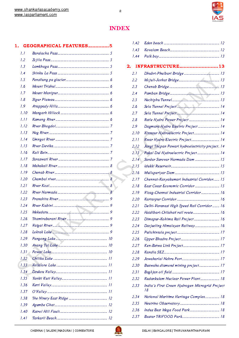 Shankar IAS Mainstorming 2022 Geographical Locations IAS Parliament English Medium Total Pages:-42 One Booklet Table of Contents 1. GEOGRAPHICAL FEATURES 2. INFRASTRUCTURE 3. ENVIRONMENT 4. ISLANDS 5. ART & CULTURE 6. OTHER PLACES