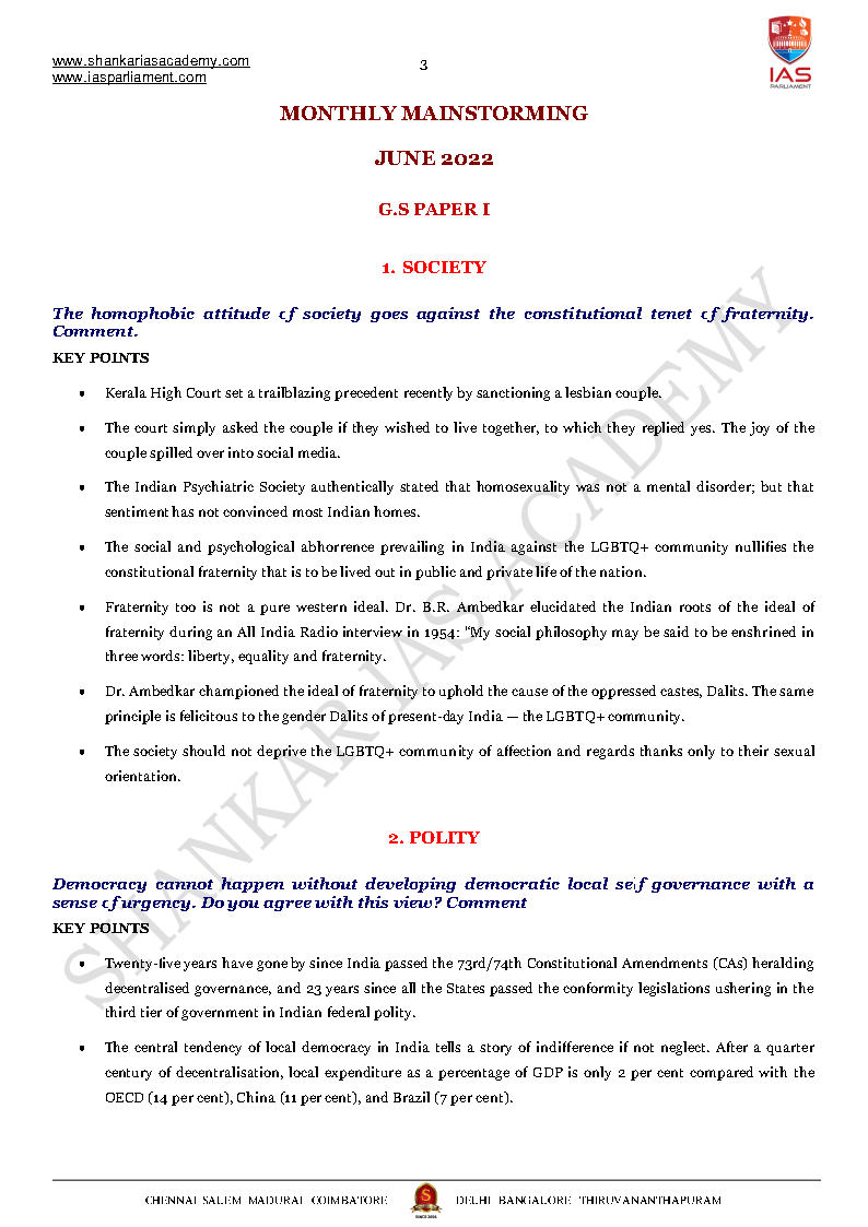 Shankar IAS Monthly Mainstorming June 2022 (IAS Parliament) English Medium Xerox