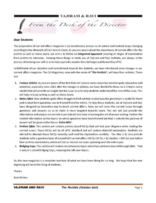 Vajiram And Ravi The Recitals Current Affairs October 2020 English Medium