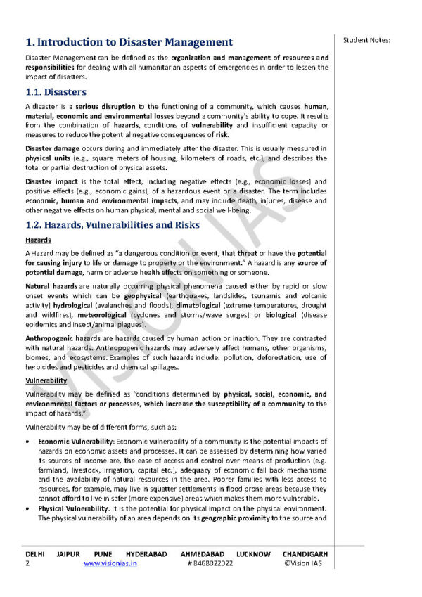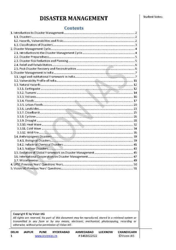 total- 64 pages 1. Introduction to Disaster Management 2. Disaster Management Cycle 3. Disaster Management in India 4. UPSC Previous Years’ Questions Years 5. Vision IAS Previous Years’ Questions