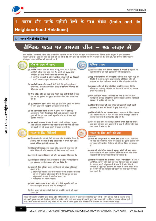 Vision IAS Mains 365 International Relations(अंतर्राष्ट्रीय सम्बन्ध) Yearly Current Affairs Hindi Medium 2022 Total Pages- 122 One Booklet 1. India And Its Neighbourhood Relations 2. Bilateral, Regional And Global Groupings And Agreements Involving India And/Or Affecting India’s Interests 3. Effect Of Policies And Politics Of Developed And Developing Countries On India’s Interests 4. Important International Institutions, Agencies And Fora- Their Structure, Mandate 5. Dynamics Of Changing World Order 6. Miscellaneous