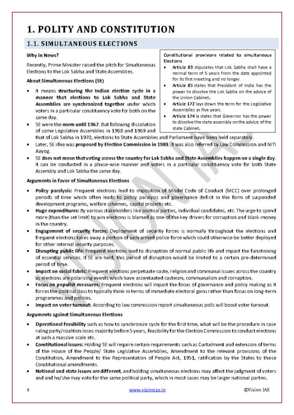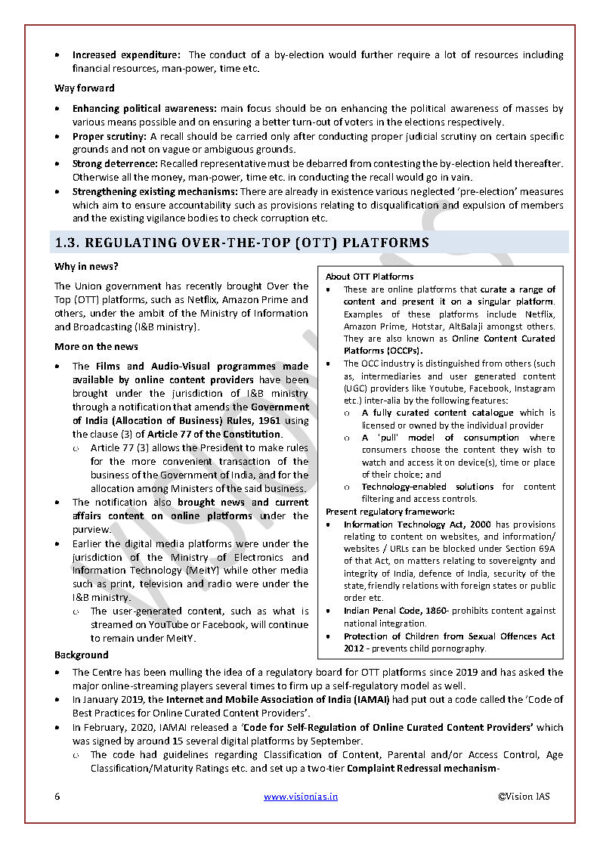 1. POLITY AND CONSTITUTION ___________ 4 1.1. Simultaneous Elections ________________ 4 1.2. Right to Recall _______________________ 5 1.3. Regulating Over-the-top (OTT) platforms _ 6 1.4. Legalising Betting in India ______________ 8 1.5. 3 Capitals for Andhra Pradesh __________ 9 1.6. Forest Rights Act ____________________ 10 2. INTERNATIONAL RELATIONS __________ 13 2.1. Regional Comprehensive Economic Partnership (RCEP) and India ______________ 13 2.2. 17th ASEAN-India Summit ____________ 14 2.3. BRICS _____________________________ 17 2.4. G20 _______________________________ 19 2.5. Shanghai Cooperation Organization (SCO) 21 2.6. Organization of the Petroleum Exporting Countries (OPEC)________________________ 23 2.7. India and Nuclear Disarmament________ 25 2.8. India’s Civil Nuclear Co-operations______ 27 2.9. India’s Development Efforts in Afghanistan ______________________________________ 29 2.10. India- Nepal Ties ___________________ 31 3. ECONOMY_________________________ 33 3.1. Changes in Bank Licensing framework ___ 33 3.1.1. Banking License to large corporate houses 33 3.1.2. Banking License for NBFCs _____________ 34 3.2. GST Tussle _________________________ 35 3.3. Inflation Targeting ___________________ 37 3.4. Liquidity Trap _______________________ 40 3.5. MSP and Procurement _______________ 40 3.6. Production Linked Incentive (PLI) Scheme 42 3.7. Solar Manufacturing in India __________ 44 3.8. Hybrid Renewable Energy_____________ 46 3.9. Model Tenancy Act, 2019 _____________ 47 4. SECURITY__________________________ 50 4.1. India’s Annual Resolution On Counter Terrorism_______ 4.2. Bio-Terrorism_______________________ 51 5. ENVIRONMENT_____________________ 54
